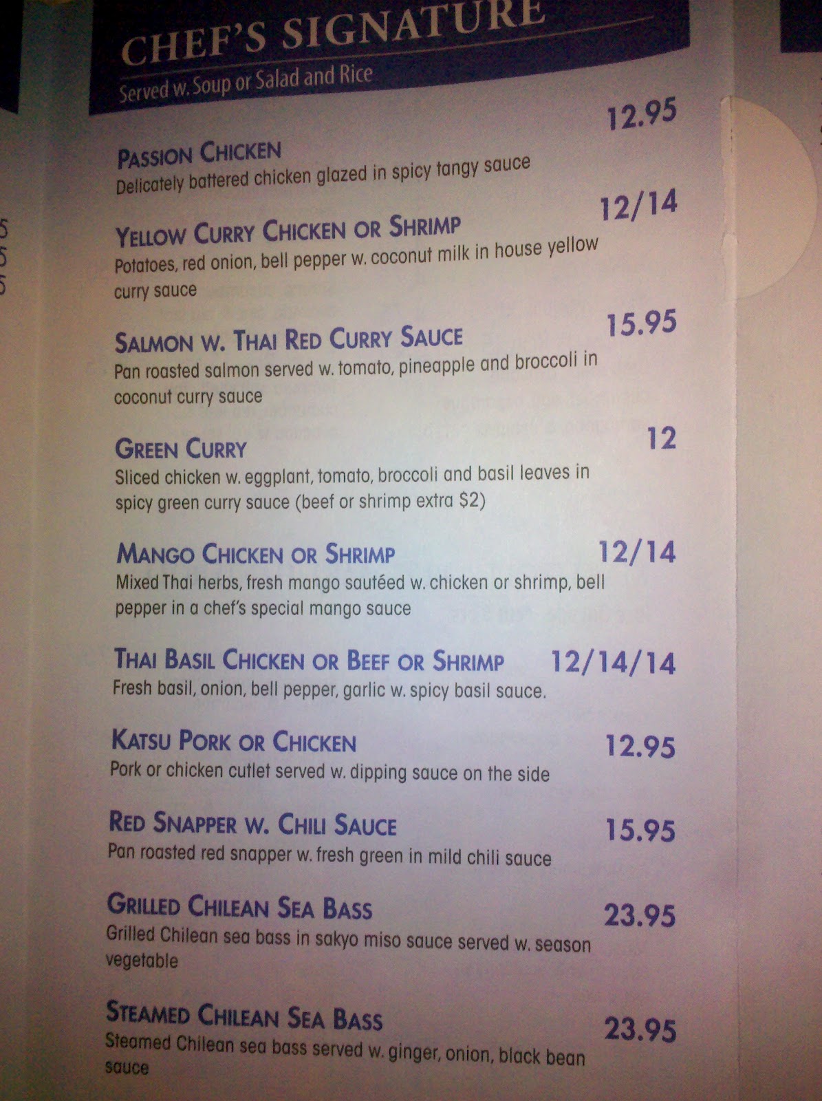 Dishes that stand out on the menu include Roti Canai (Indian pancake), Lump Crab Asparagus Soup, Yum Chicken Salad, Lobster and Filet Mignon hibachi dinner (pricey at $26.95), Passion Chicken, and Fire Work Ice Cream.