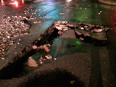 WSSC and MD State Highway Administration officials discussing the situation on site about an hour ago suggested it will be "a long night." More digging is required, and workers were searching for the precise location of the main break beneath one of Montgomery County's busiest commuter routes.