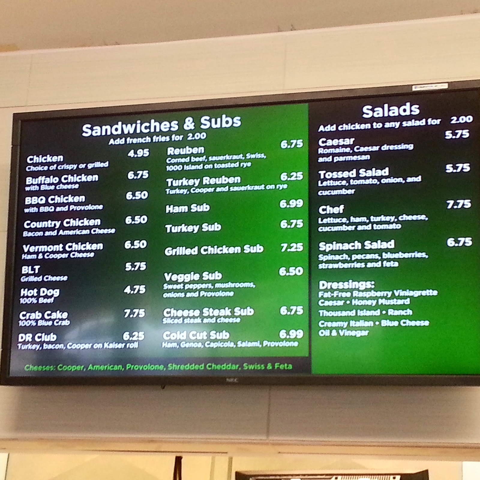 What from the OC menus doesn't show up here? Dayton's Chicken (which is only available at one of the OC locations, anyway); the Dough Roller Supreme, Meat Explosion and Pepperoni Obsessed pizzas; Italian and Seafood Dinner platters; and funnel cake fries. But many favorites did make the leap across the Bay, including the Crab Burger. And at least a couple of items that seem to be exclusive to Rockville. Having said all that, the menu changes with the time of day (for example, the breakfast items were not on display in these photos), and additional items may be added over time. Click menu photos to enlarge for detail: