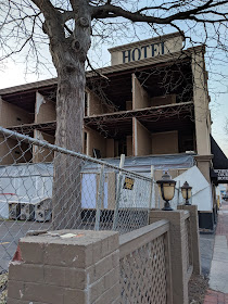 Demolition of the Bethesda Court Hotel continues on Wisconsin Avenue across from the Bethesda Theater and Chevy Chase Cars. The site is being cleared for Marriott's relocated headquarters.