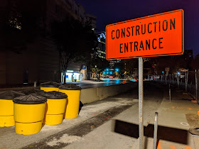 The right curb lane, and several metered parking spaces, on Woodmont Avenue have been taken over by the construction team for the Edgemont II condo tower at Edgemoor Lane in downtown Bethesda. Hastily-erected walls made from jersey barriers, weighted garbage cans and barrels block access to public right-of-way and parking spaces. A sign directs construction traffic in the now-private lane. No current activity at the site requires closing a traffic lane, a once-forbidden practice that the now-politicized Montgomery County and Maryland Departments of Transportation now eagerly grant at the drop of a hat.