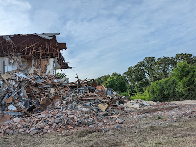 Heavy equipment is making short work of the long-vacant Springhouse of Westwood by Manor Care nursing home at 5101 Ridgefield Road, in the Westbard area of Bethesda. Even most longtime residents are getting their first look inside the building, as the brick walls are smashed away. The nursing home will be replaced by over 50 townhomes to be developed by EYA over the next several years. Springhouse was one of several structures in the Westwood development designed by prominent Montgomery County architect John A. d’Epagnier, including the Westwood Shopping Center and Westwood Tower apartments.