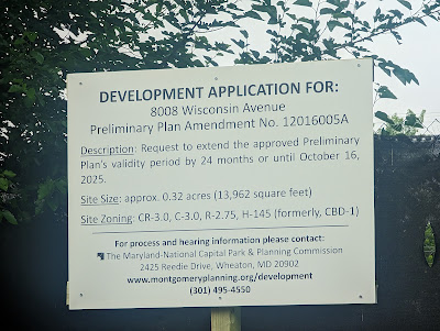 I bet the developers of the Artena project will contract with the owners of the 8008 Wisconsin parcel, and use it for construction staging. Once the Artena is complete in about 2 years, that site could be redeveloped as approved for condos, with the proposed approval extension.