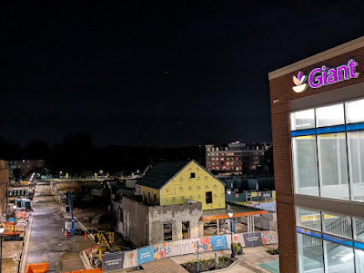 Construction is now well-advanced on the Phase 1 Brownstones at Westbard Square, located on the former Westwood Shopping Center parking lot at 5400 Westbard Avenue in Bethesda. A street grid lined with streetlamps and homes is taking shape as a new neighborhood developed by Bethesda-based EYA within the Regency Centers development. I wonder if the townhomes closest to the parking garage are the Moderately-Priced Dwelling Units (MPDUs). From the top of the parking deck, you can also see the "Canal House" restaurant or retail building coming together at the top of The Green, wrapped in yellow Tyvek. Its future tenant is currently unknown.