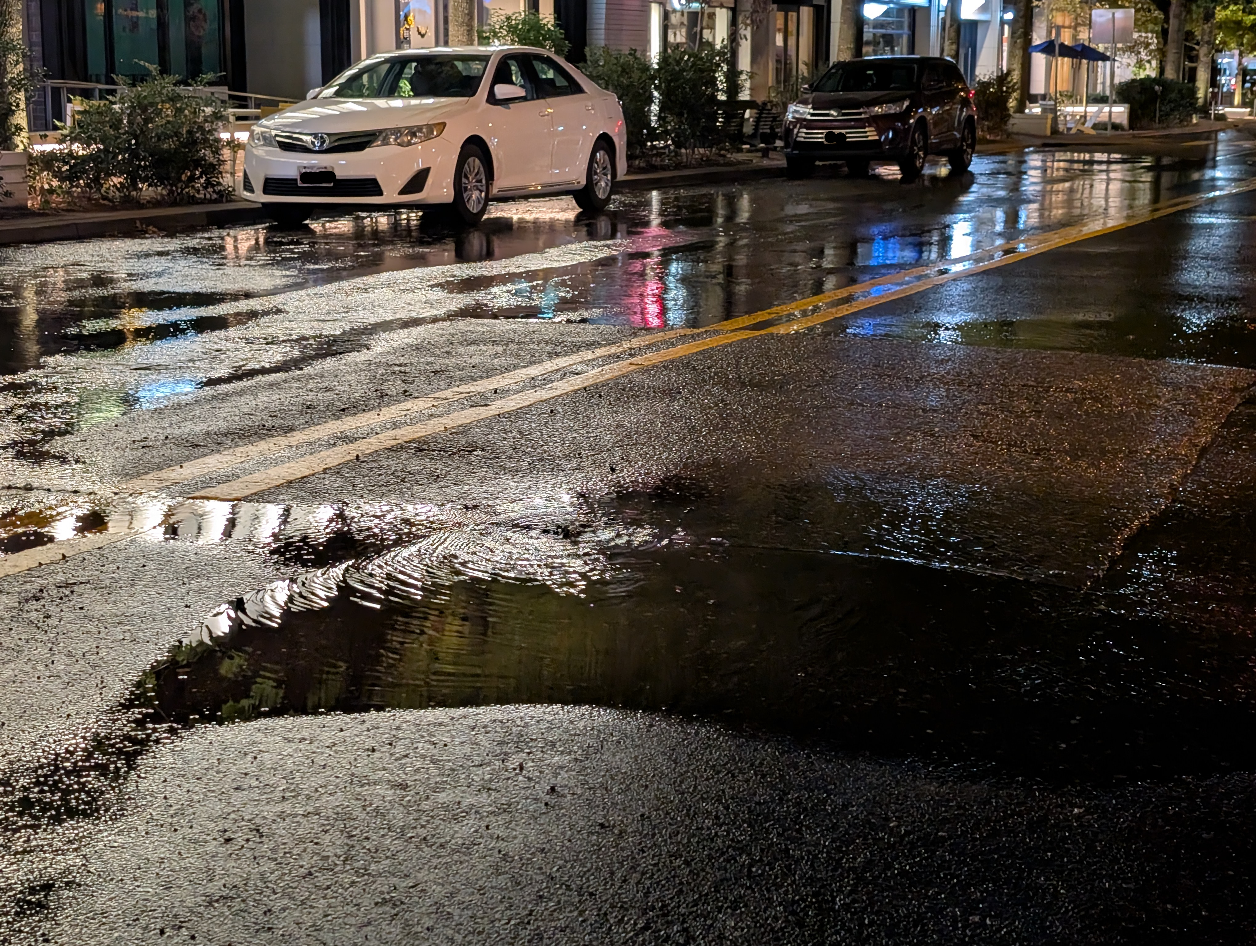 A water main break occurred last night on Bethesda Avenue, between Arlington Road and Woodmont Avenue, in the area of Bethesda Row. Substantial pooling of water was evident, as well as a small gusher rising from the pavement. Temperatures have been unseasonably wide in variation over the last couple of weeks, with highs in the 70s often falling to lows near 40 degrees at night. Thus, it is not surprising to see water main breaks, even though they are more typical in winter months.